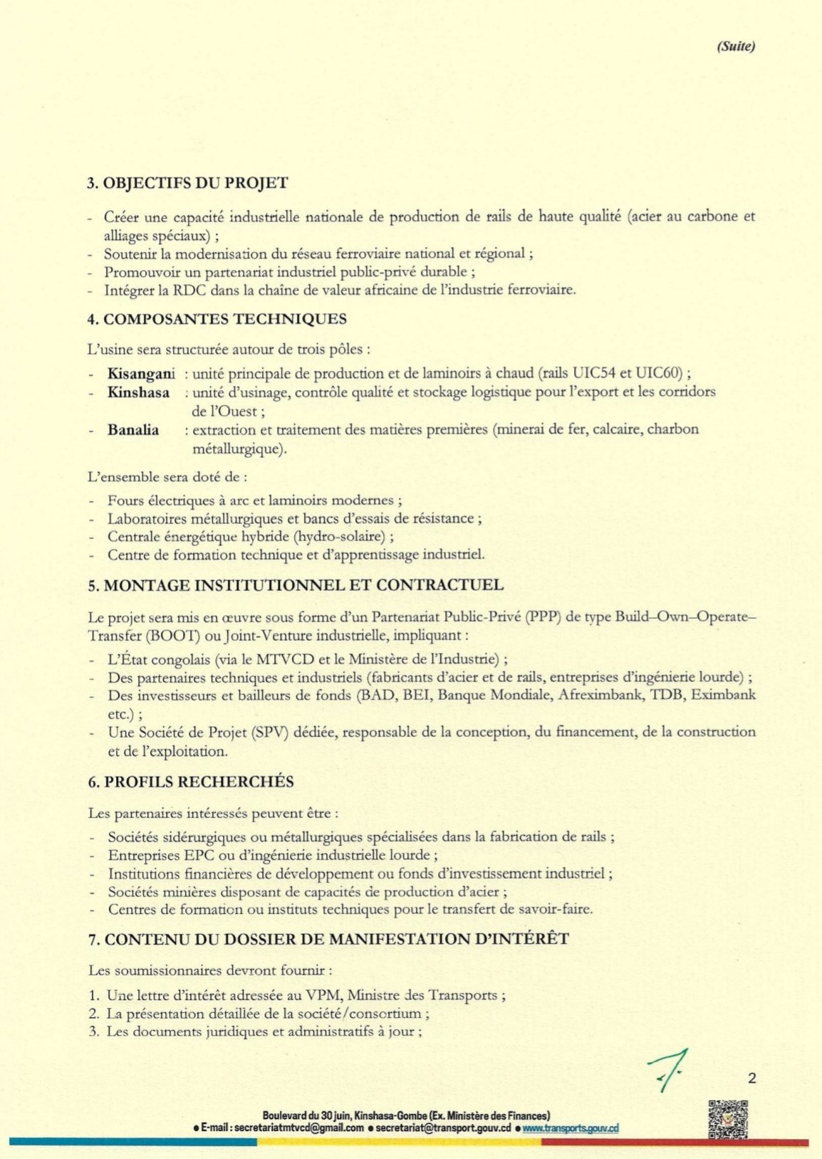 Selon le document officiel publié par le MTVCD, le projet s’inscrit dans une ambition claire : doter la RDC d’une capacité industrielle nationale de production de rails ferroviaires de haute qualité, notamment des rails standards UIC 54 et UIC 60, utilisés sur les réseaux modernes à forte capacité.