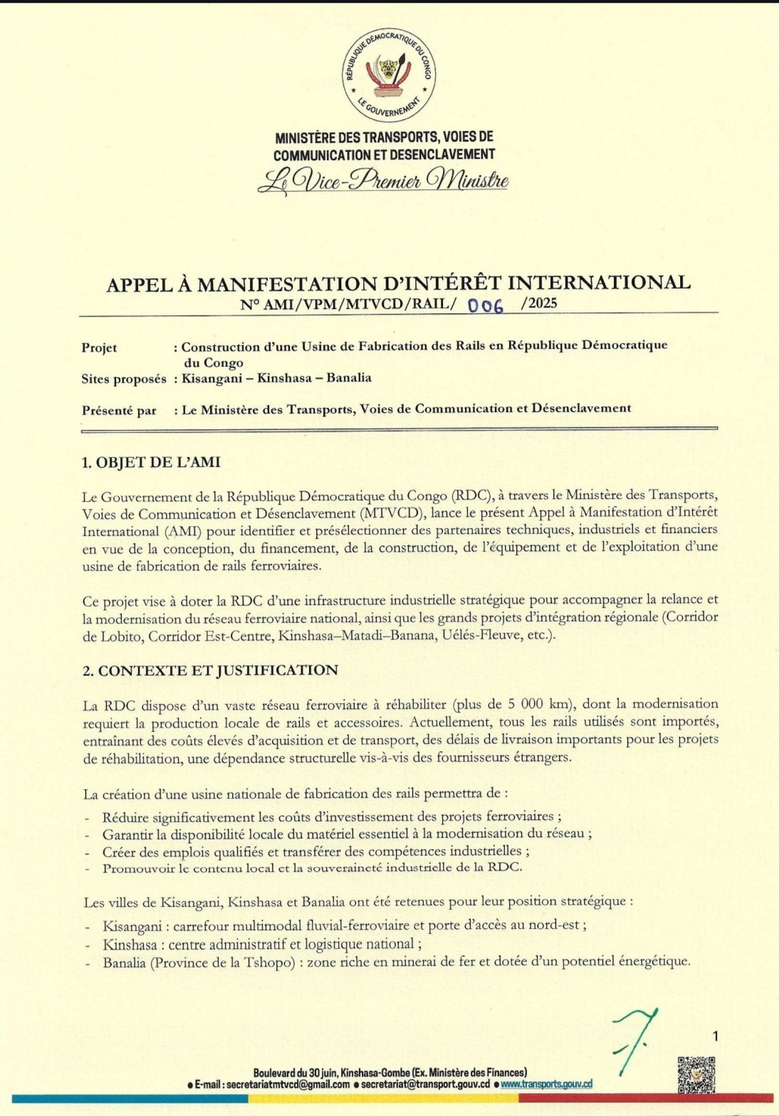 Le gouvernement de la République démocratique du Congo (RDC) franchit une nouvelle étape stratégique dans la relance de son réseau ferroviaire et l’industrialisation de sa chaîne logistique. À travers le Ministère des Transports, Voies de Communication et Désenclavement (MTVCD), sous l’autorité du Vice-Premier ministre, les autorités congolaises ont officiellement lancé un Appel à Manifestation d’Intérêt International (AMI) pour la construction d’une usine de fabrication de rails ferroviaires sur le territoire national.